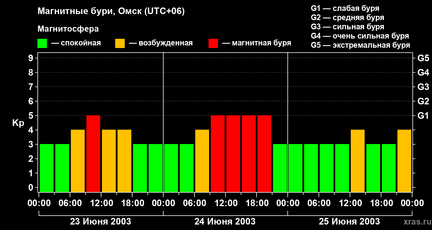 Изменения геомагнитного индекса Kp с 23 по 25 июня 2003 года для средних широт