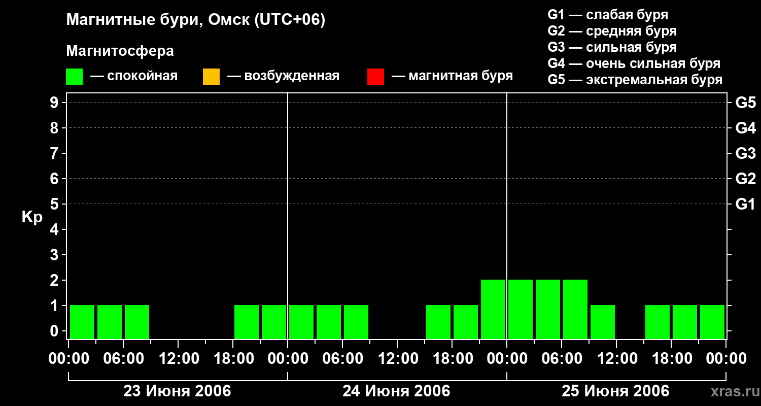 Изменения геомагнитного индекса Kp с 23 по 25 июня 2006 года для средних широт