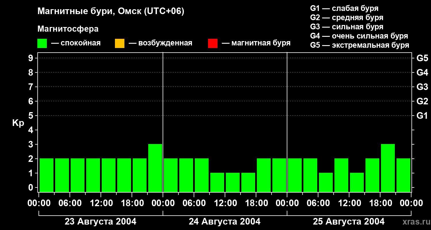 Изменения геомагнитного индекса Kp с 23 по 25 августа 2004 года для средних широт