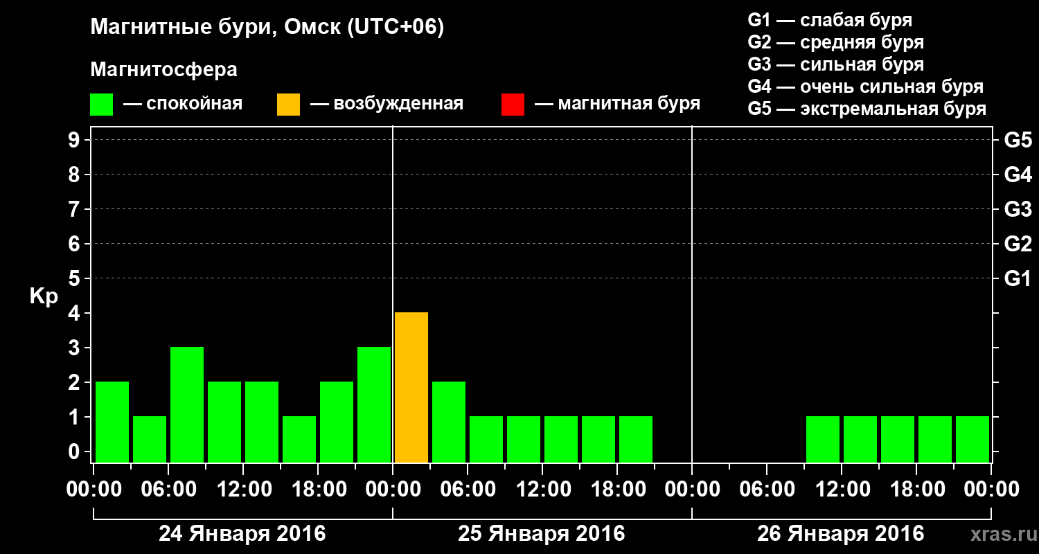 Изменения геомагнитного индекса Kp с 24 по 26 января 2016 года для средних широт