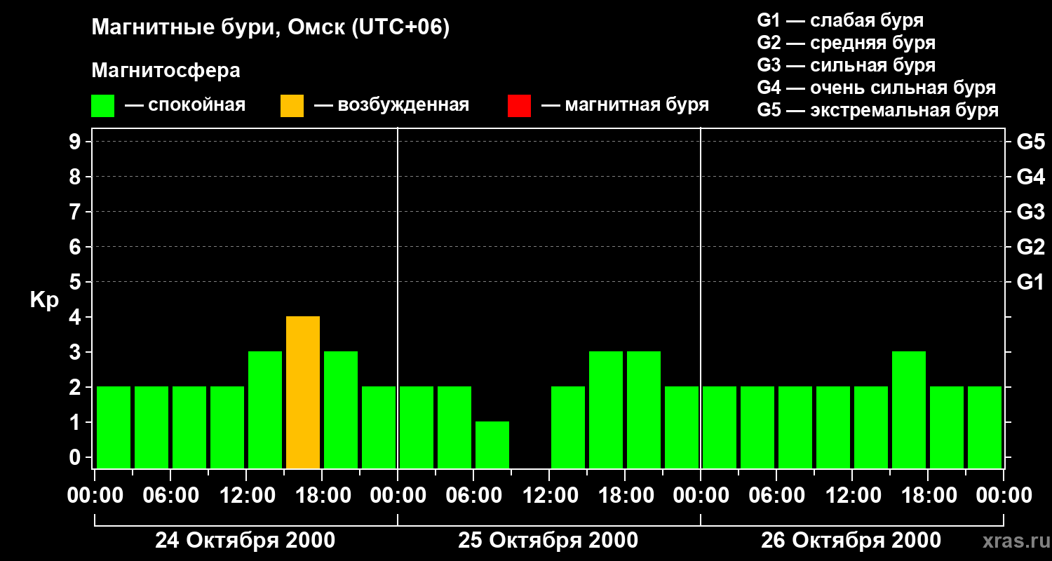 Изменения геомагнитного индекса Kp с 24 по 26 октября 2000 года для средних широт
