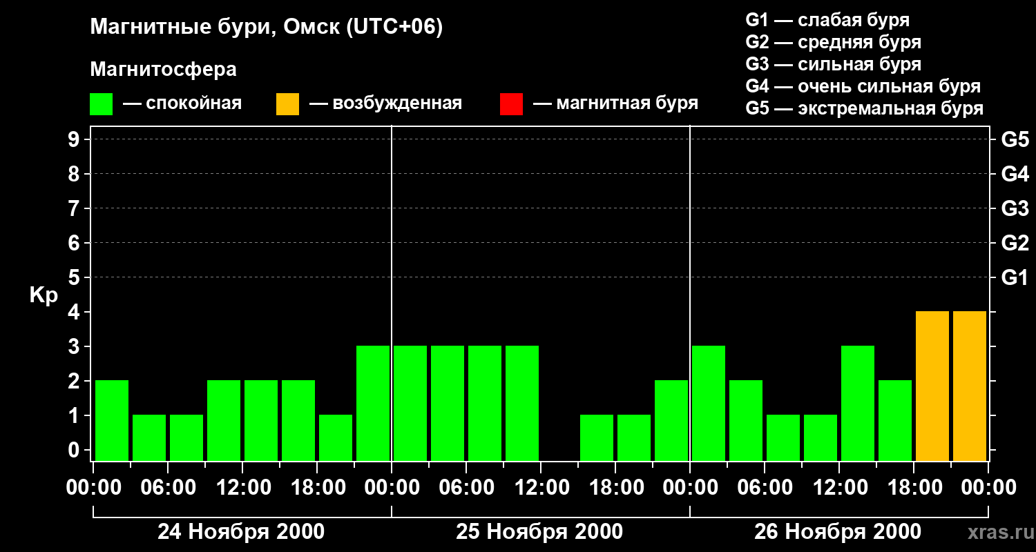 Изменения геомагнитного индекса Kp с 24 по 26 ноября 2000 года для средних широт