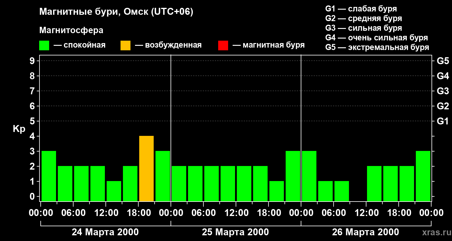Изменения геомагнитного индекса Kp с 24 по 26 марта 2000 года для средних широт