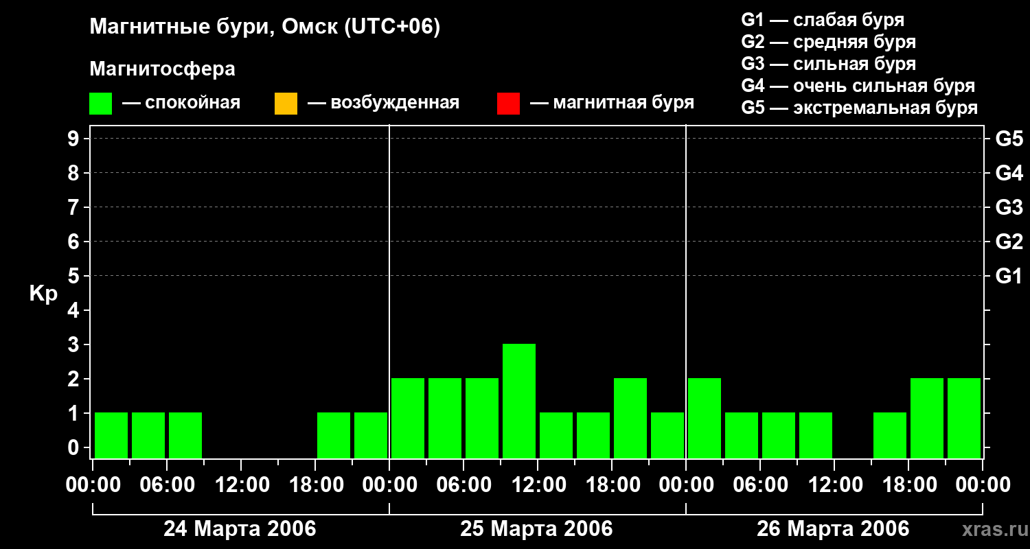 Изменения геомагнитного индекса Kp с 24 по 26 марта 2006 года для средних широт