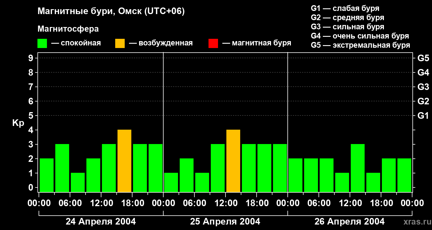 Изменения геомагнитного индекса Kp с 24 по 26 апреля 2004 года для средних широт