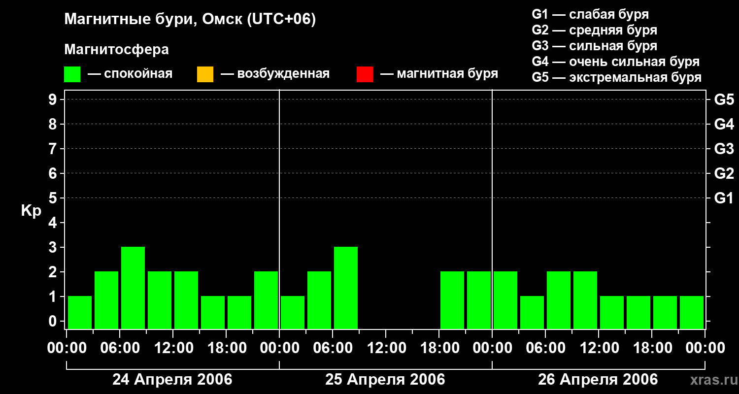 Изменения геомагнитного индекса Kp с 24 по 26 апреля 2006 года для средних широт