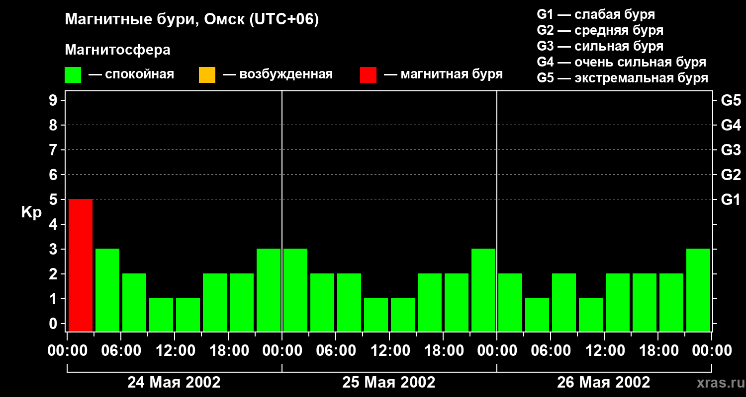 Изменения геомагнитного индекса Kp с 24 по 26 мая 2002 года для средних широт