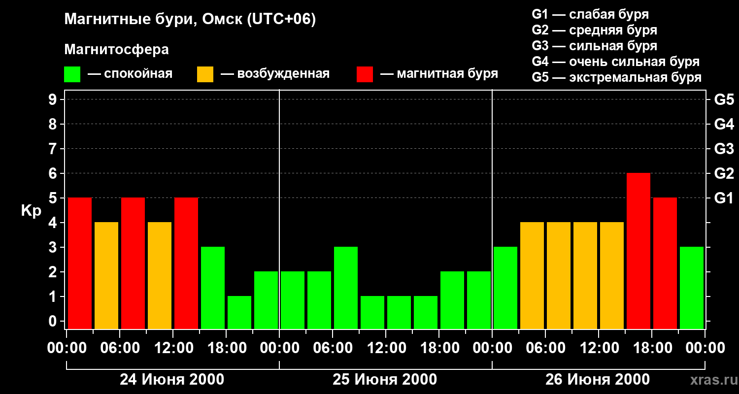Изменения геомагнитного индекса Kp с 24 по 26 июня 2000 года для средних широт