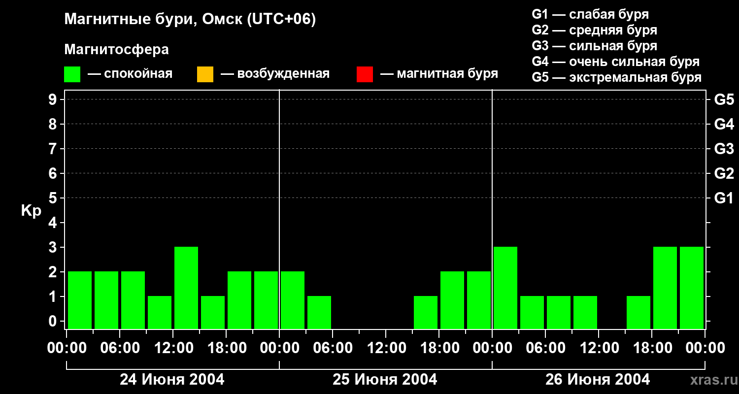 Изменения геомагнитного индекса Kp с 24 по 26 июня 2004 года для средних широт