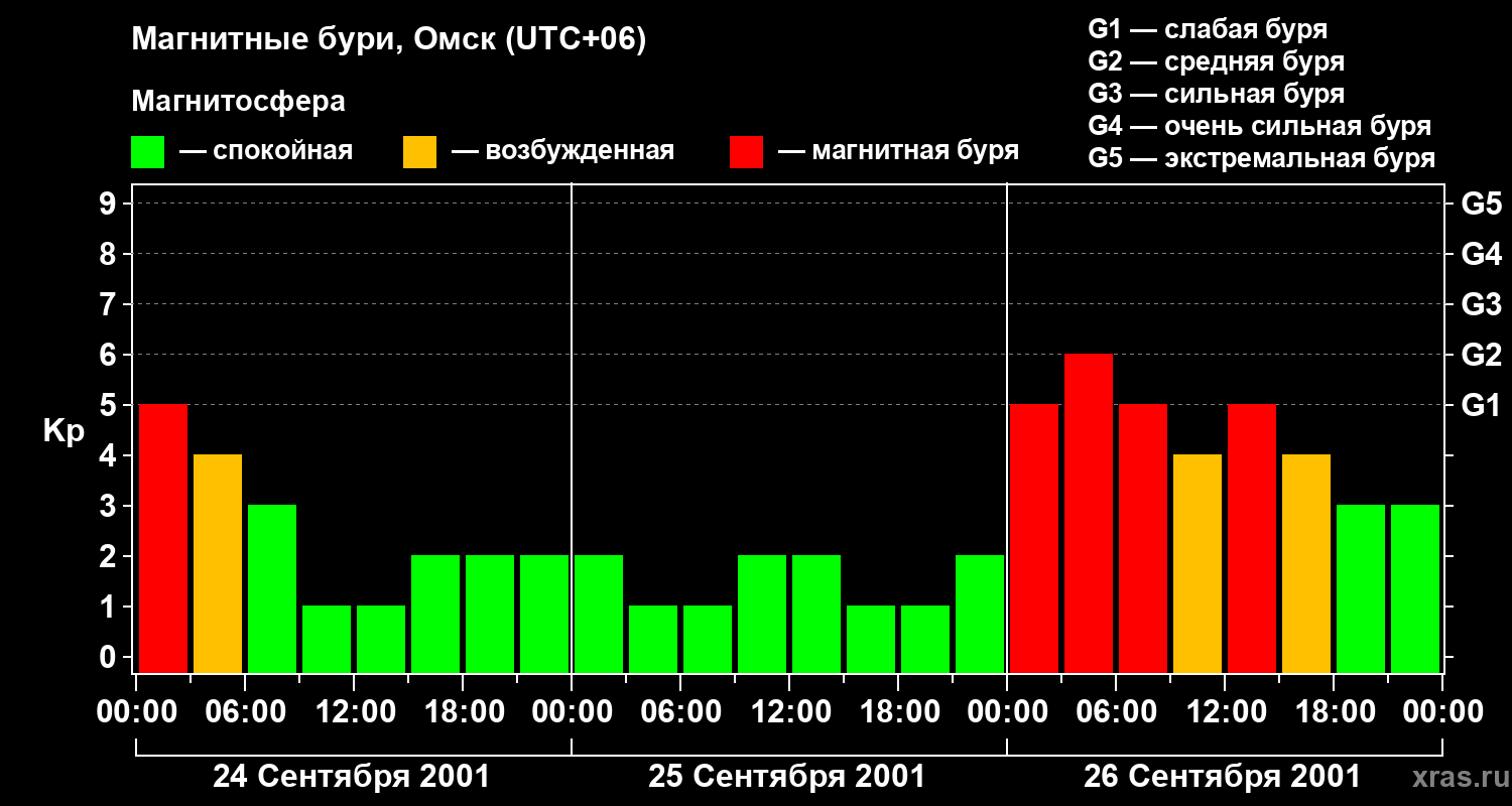 Изменения геомагнитного индекса Kp с 24 по 26 сентября 2001 года для средних широт
