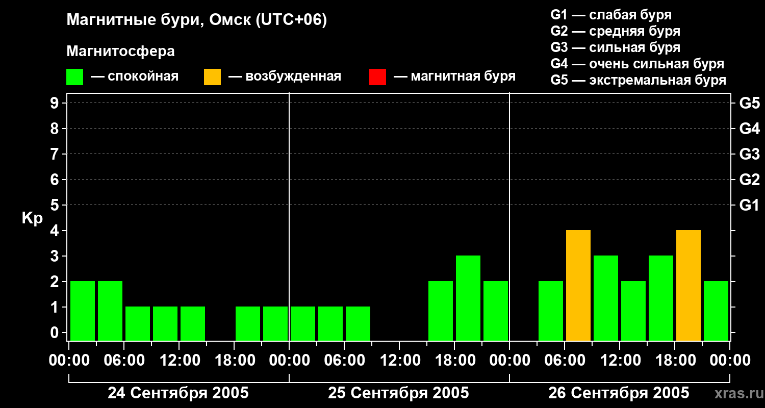 Изменения геомагнитного индекса Kp с 24 по 26 сентября 2005 года для средних широт