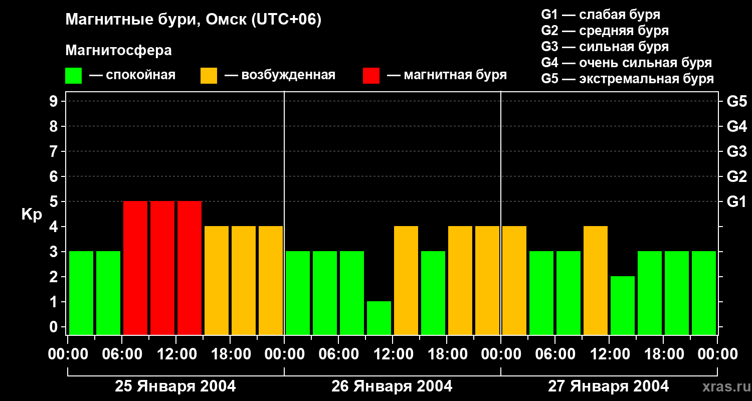 Изменения геомагнитного индекса Kp с 25 по 27 января 2004 года для средних широт