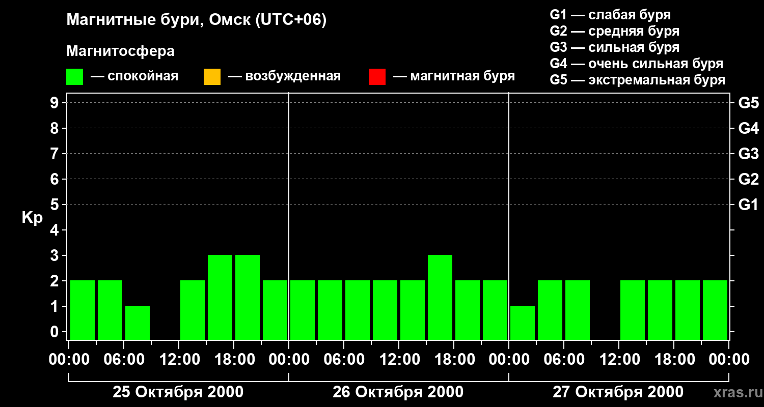 Изменения геомагнитного индекса Kp с 25 по 27 октября 2000 года для средних широт