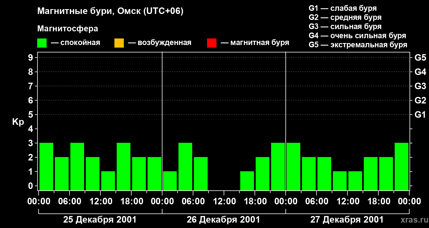 Изменения геомагнитного индекса Kp с 25 по 27 декабря 2001 года для средних широт