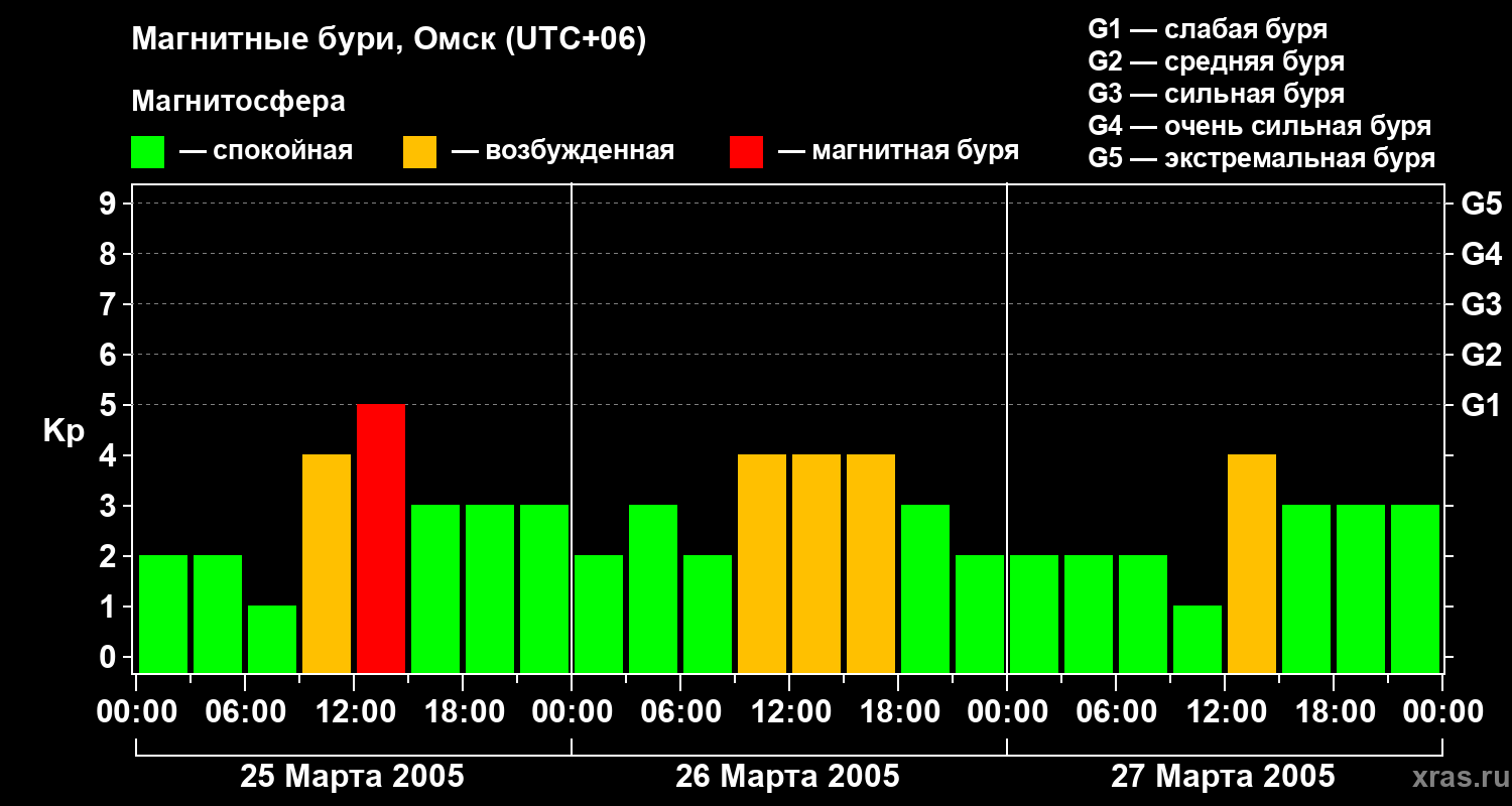 Изменения геомагнитного индекса Kp с 25 по 27 марта 2005 года для средних широт