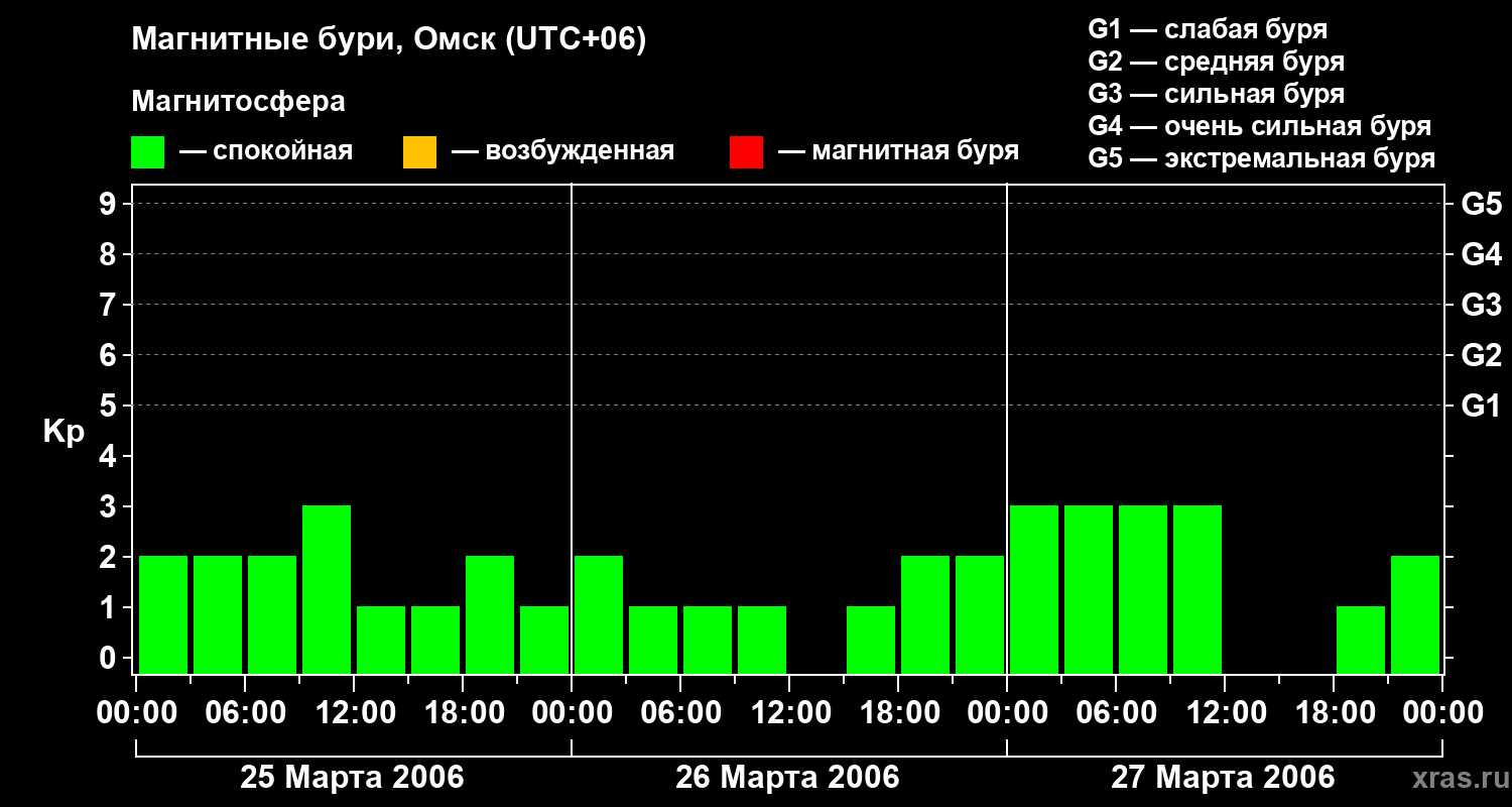 Изменения геомагнитного индекса Kp с 25 по 27 марта 2006 года для средних широт