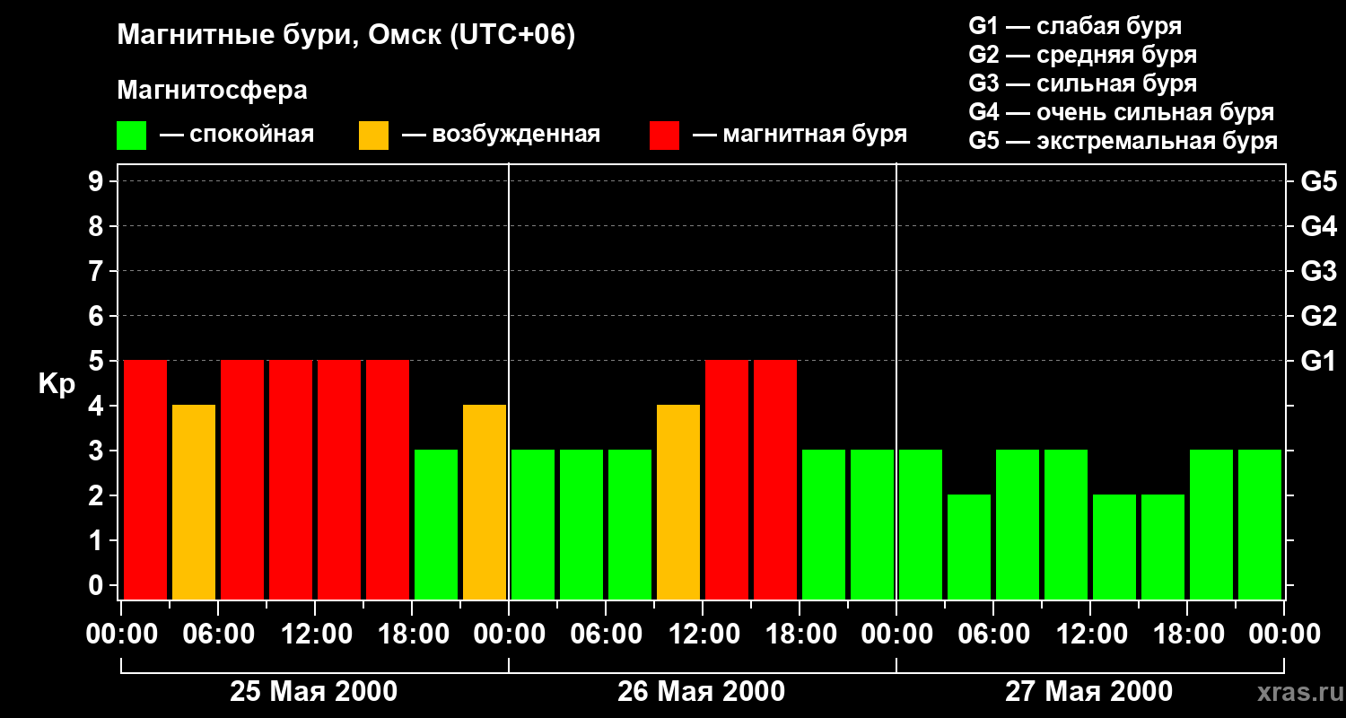 Изменения геомагнитного индекса Kp с 25 по 27 мая 2000 года для средних широт