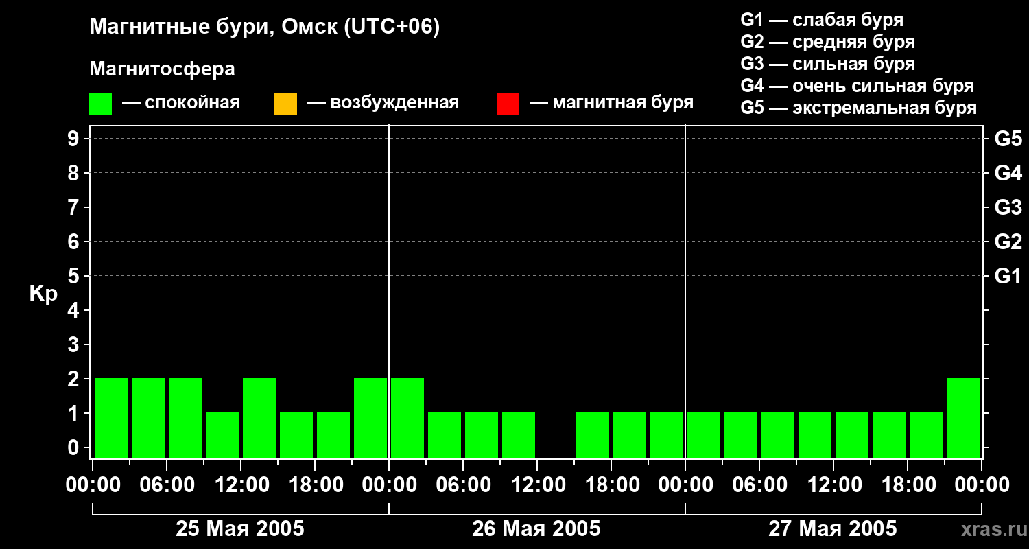 Изменения геомагнитного индекса Kp с 25 по 27 мая 2005 года для средних широт