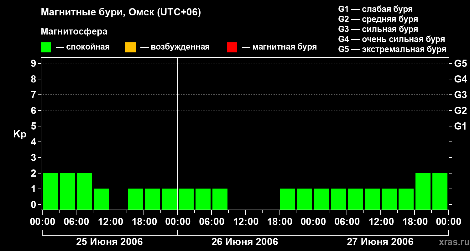 Изменения геомагнитного индекса Kp с 25 по 27 июня 2006 года для средних широт