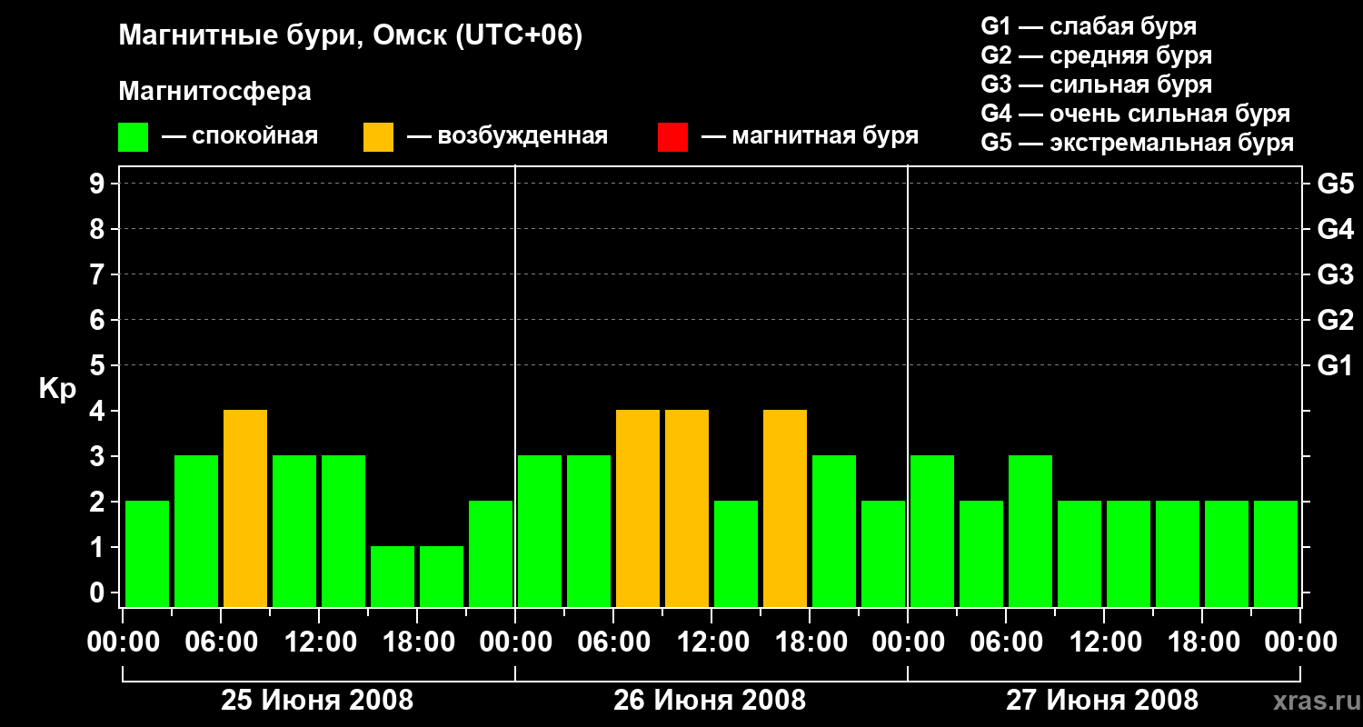 Изменения геомагнитного индекса Kp с 25 по 27 июня 2008 года для средних широт