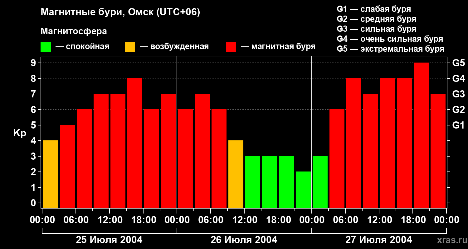 Изменения геомагнитного индекса Kp с 25 по 27 июля 2004 года для средних широт