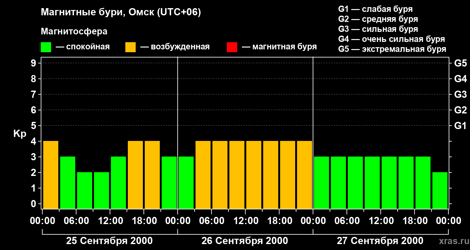 Изменения геомагнитного индекса Kp с 25 по 27 сентября 2000 года для средних широт