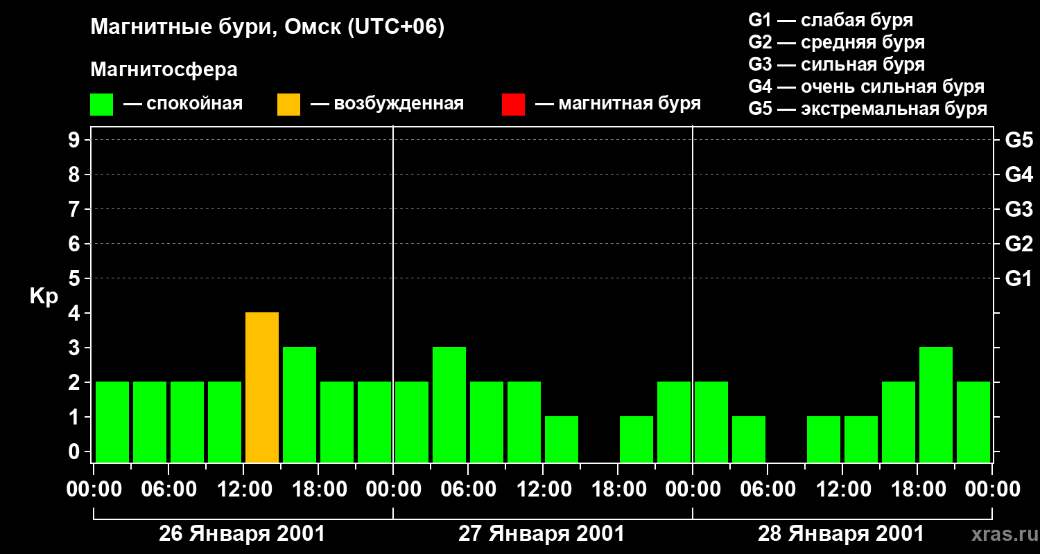 Изменения геомагнитного индекса Kp с 26 по 28 января 2001 года для средних широт
