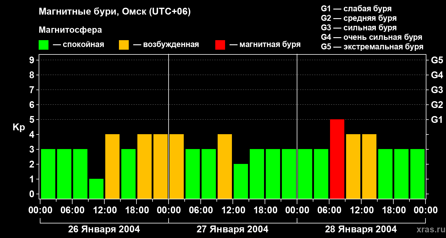 Изменения геомагнитного индекса Kp с 26 по 28 января 2004 года для средних широт