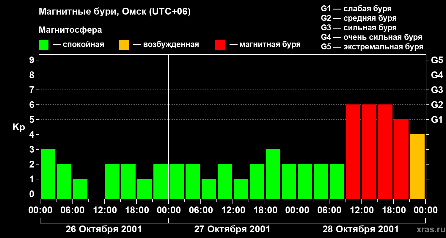 Изменения геомагнитного индекса Kp с 26 по 28 октября 2001 года для средних широт