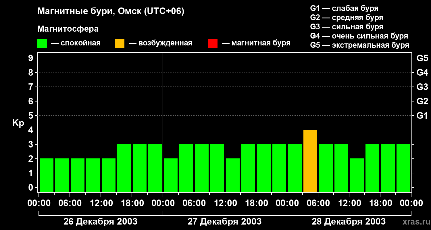 Изменения геомагнитного индекса Kp с 26 по 28 декабря 2003 года для средних широт