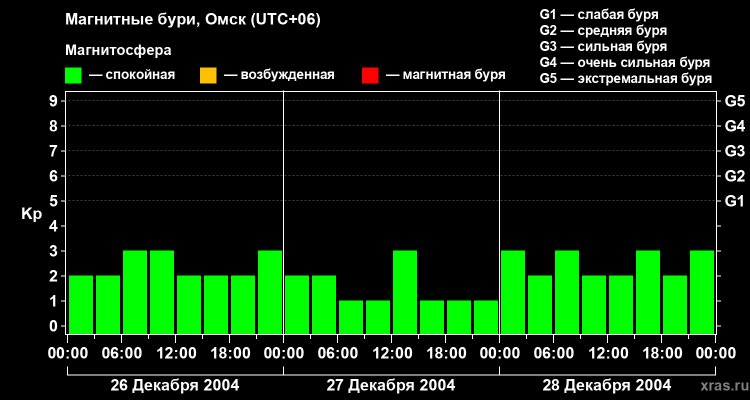 Изменения геомагнитного индекса Kp с 26 по 28 декабря 2004 года для средних широт