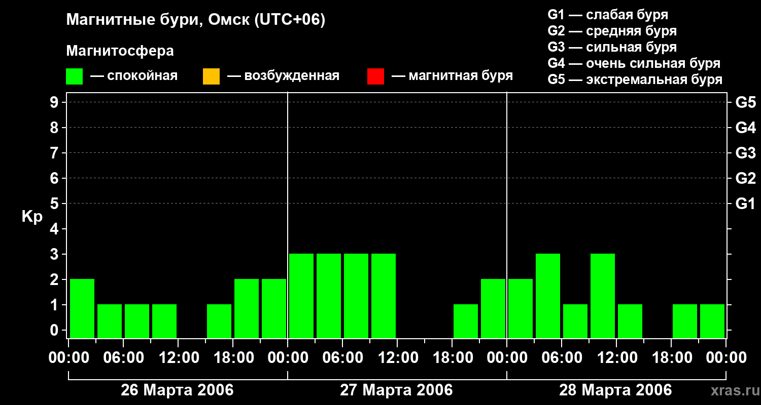 Изменения геомагнитного индекса Kp с 26 по 28 марта 2006 года для средних широт