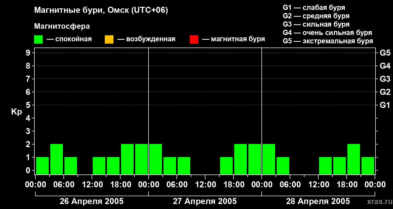 Изменения геомагнитного индекса Kp с 26 по 28 апреля 2005 года для средних широт