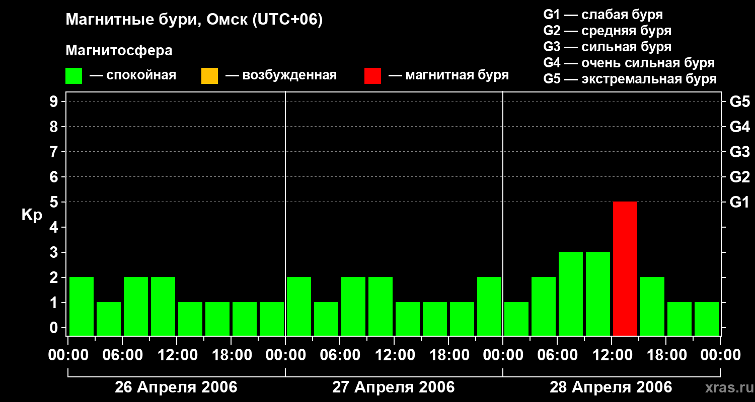 Изменения геомагнитного индекса Kp с 26 по 28 апреля 2006 года для средних широт