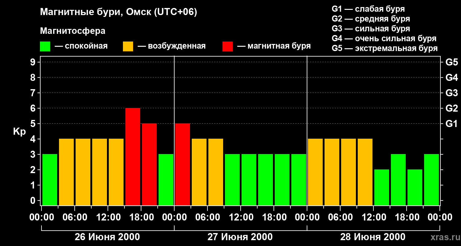 Изменения геомагнитного индекса Kp с 26 по 28 июня 2000 года для средних широт