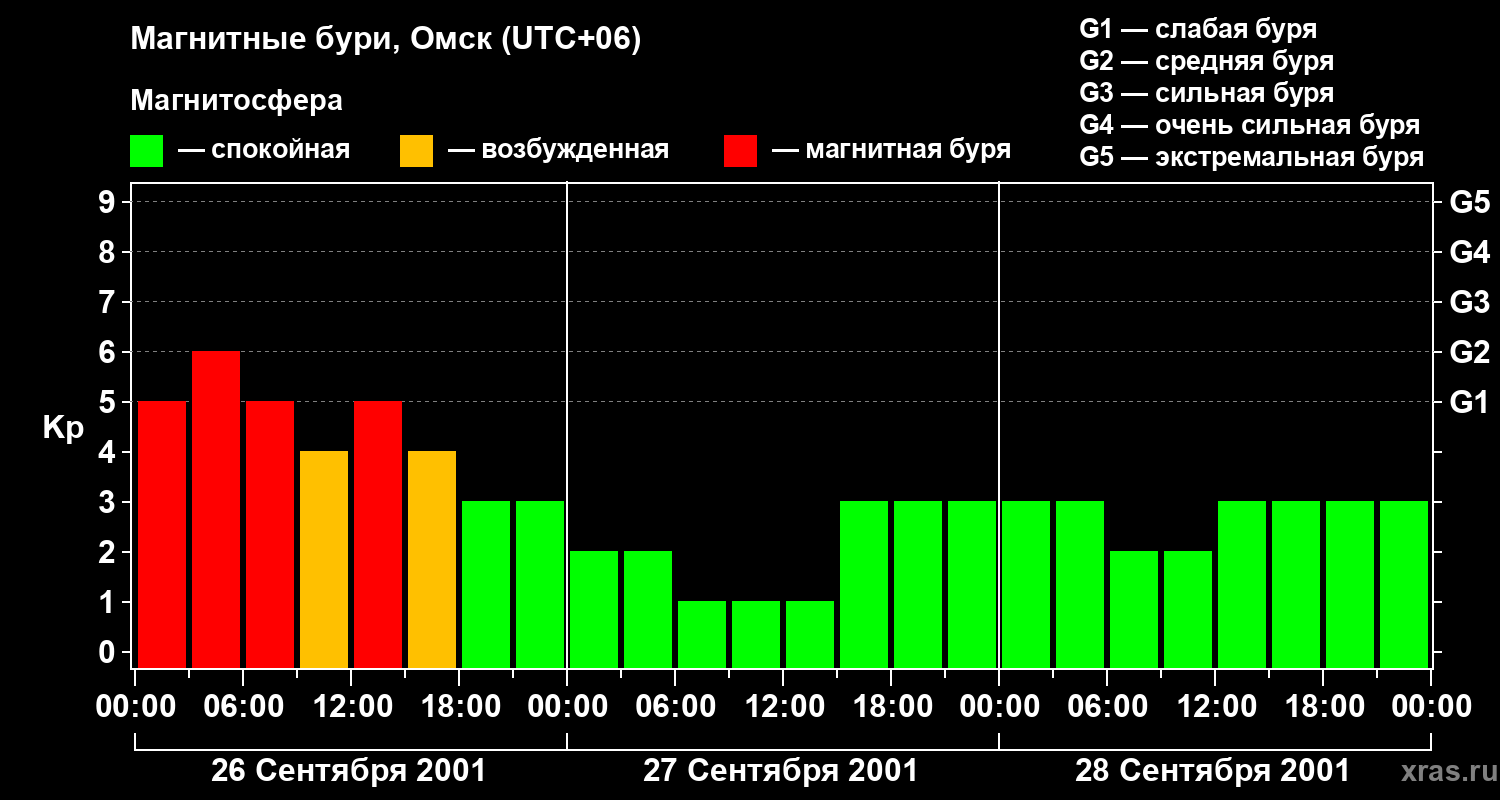 Изменения геомагнитного индекса Kp с 26 по 28 сентября 2001 года для средних широт