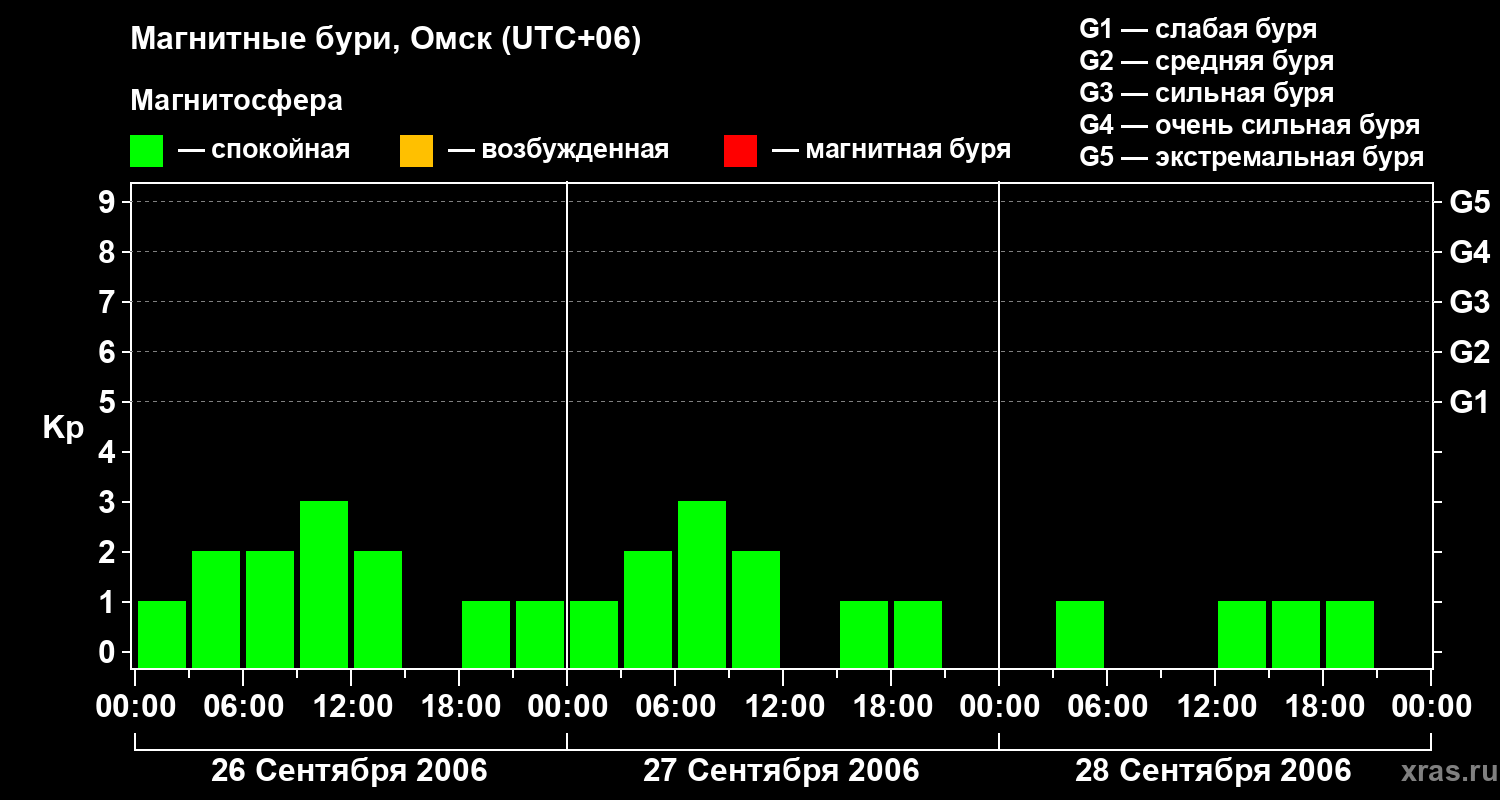 Изменения геомагнитного индекса Kp с 26 по 28 сентября 2006 года для средних широт