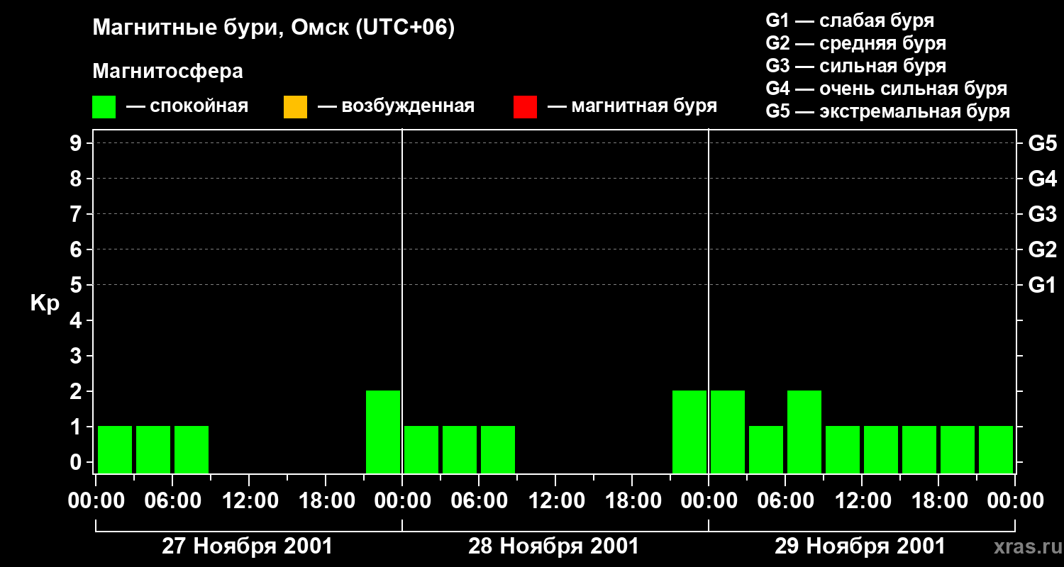 Изменения геомагнитного индекса Kp с 27 по 29 ноября 2001 года для средних широт