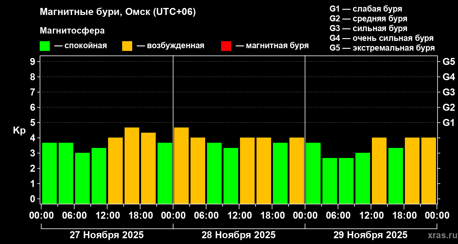 Изменения геомагнитного индекса Kp с 27 по 29 ноября 2025 года для средних широт