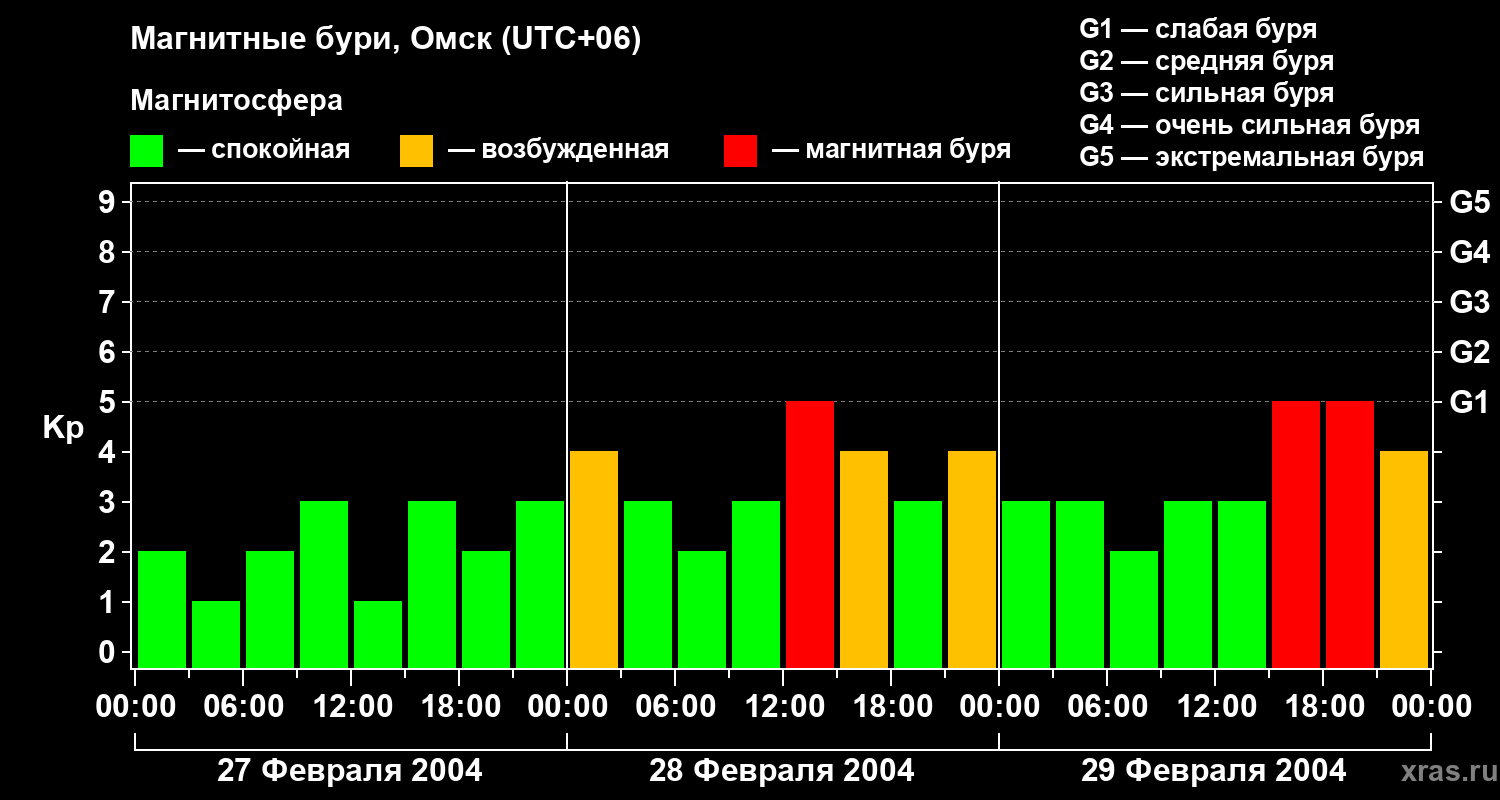 Изменения геомагнитного индекса Kp с 27 по 29 февраля 2004 года для средних широт