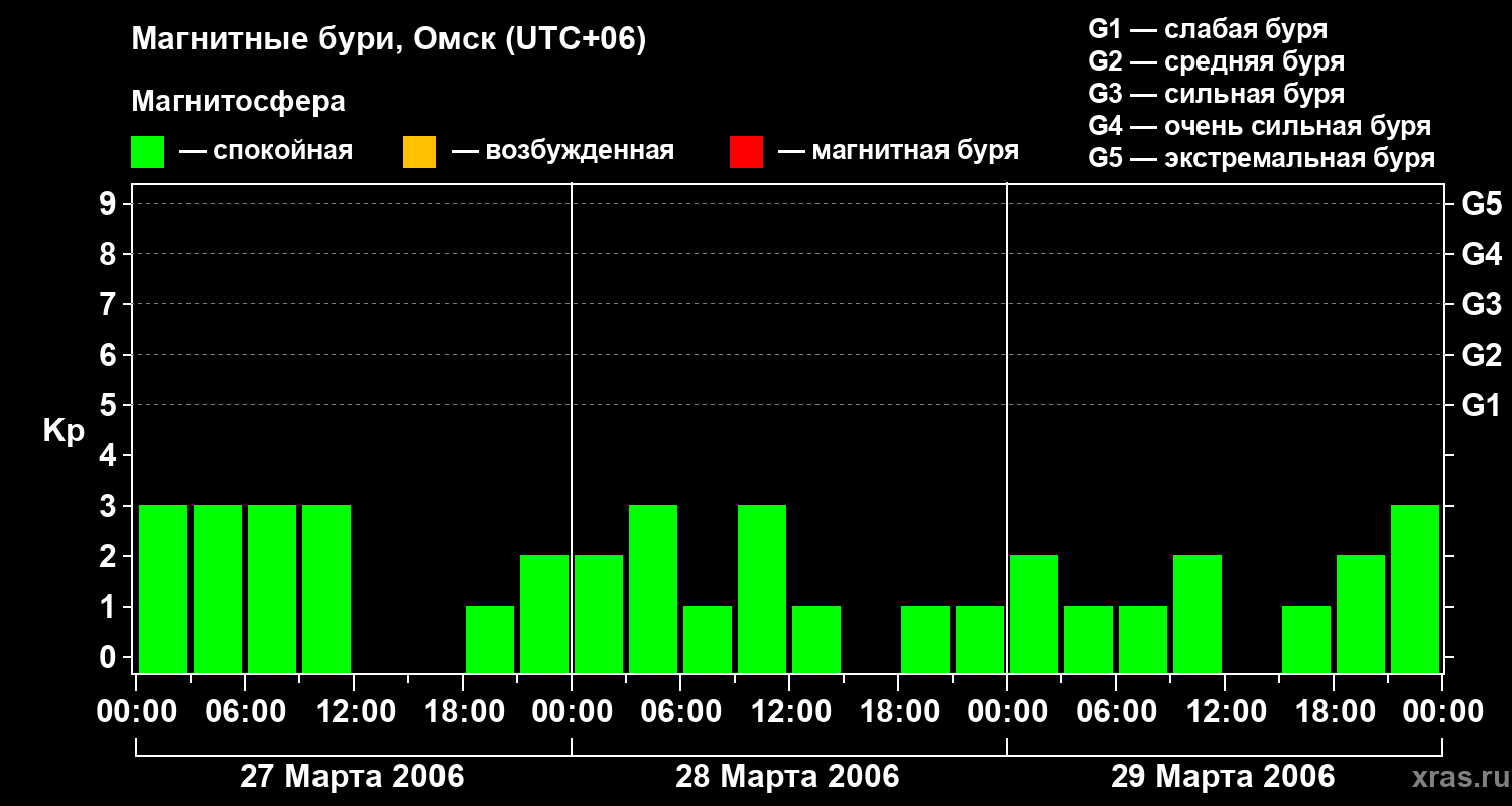 Изменения геомагнитного индекса Kp с 27 по 29 марта 2006 года для средних широт