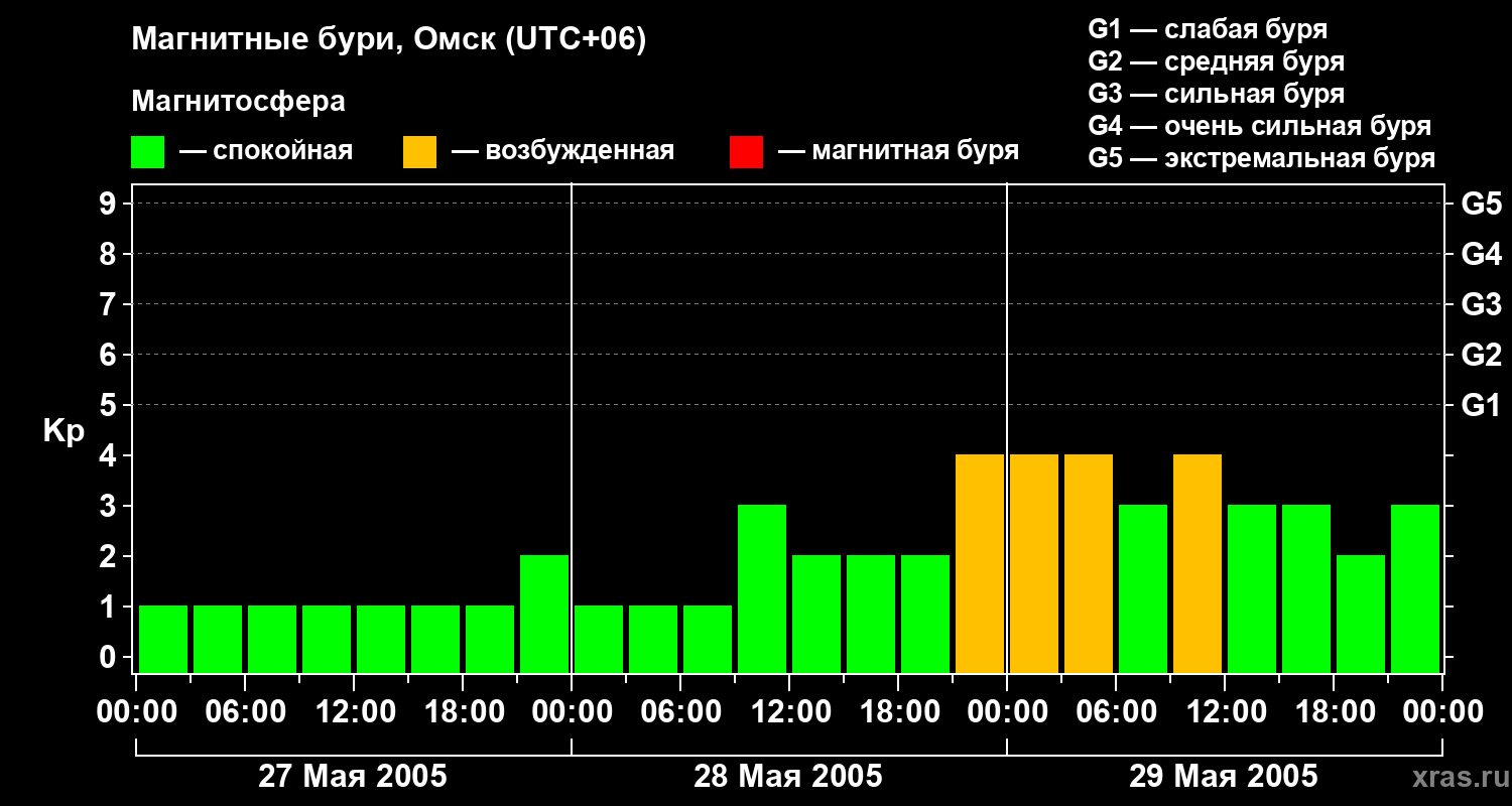 Изменения геомагнитного индекса Kp с 27 по 29 мая 2005 года для средних широт