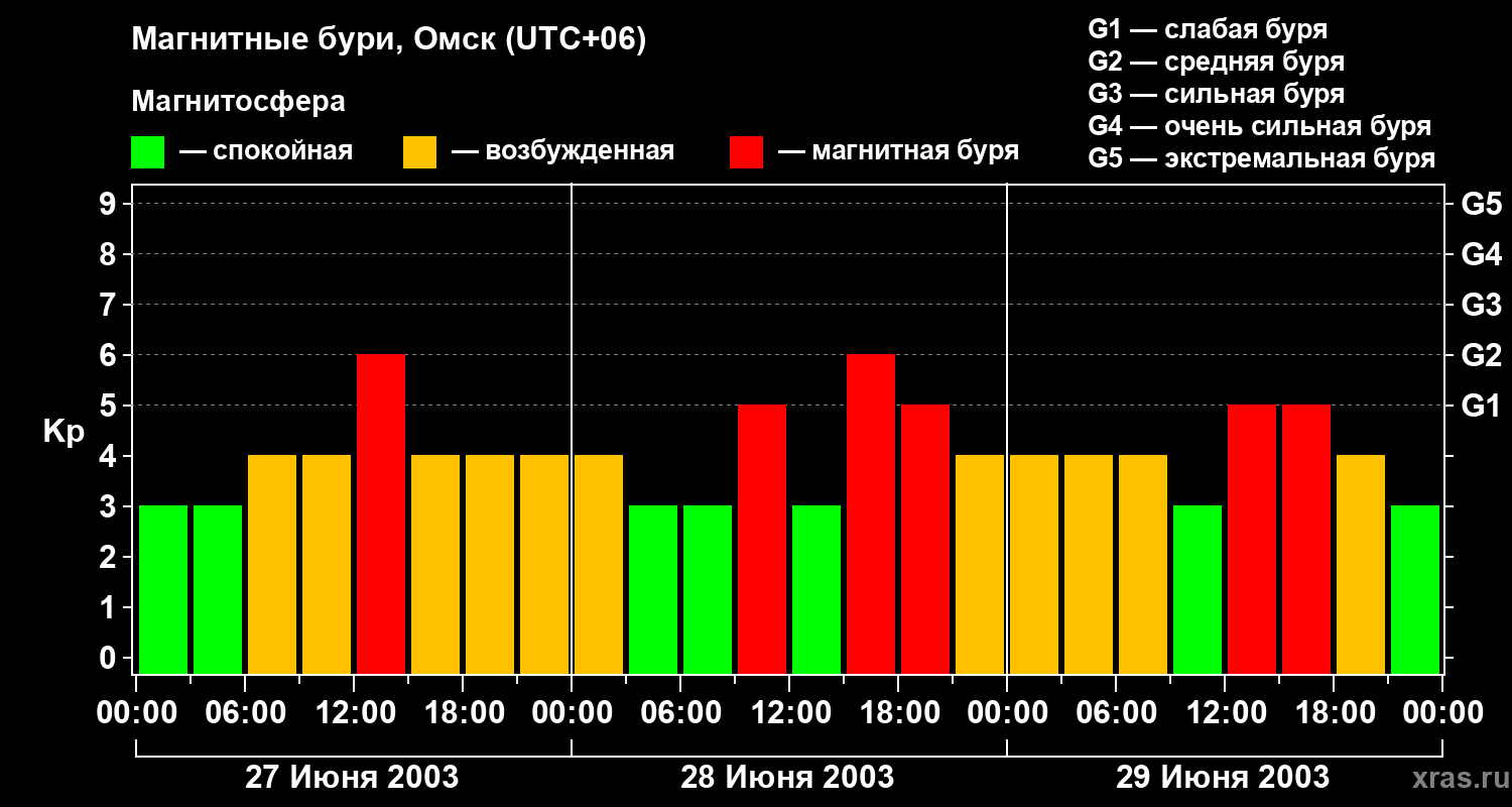 Изменения геомагнитного индекса Kp с 27 по 29 июня 2003 года для средних широт