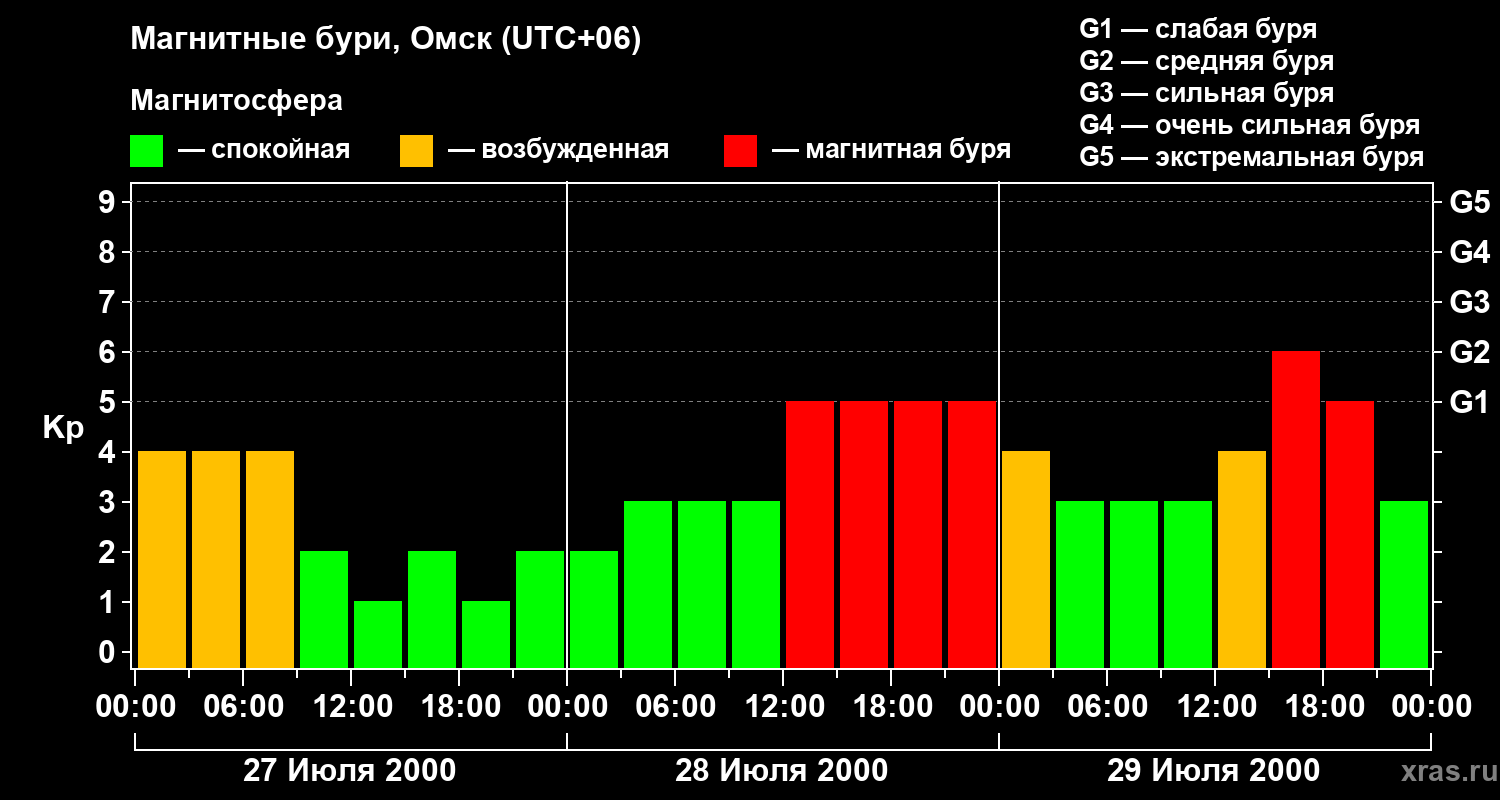 Изменения геомагнитного индекса Kp с 27 по 29 июля 2000 года для средних широт