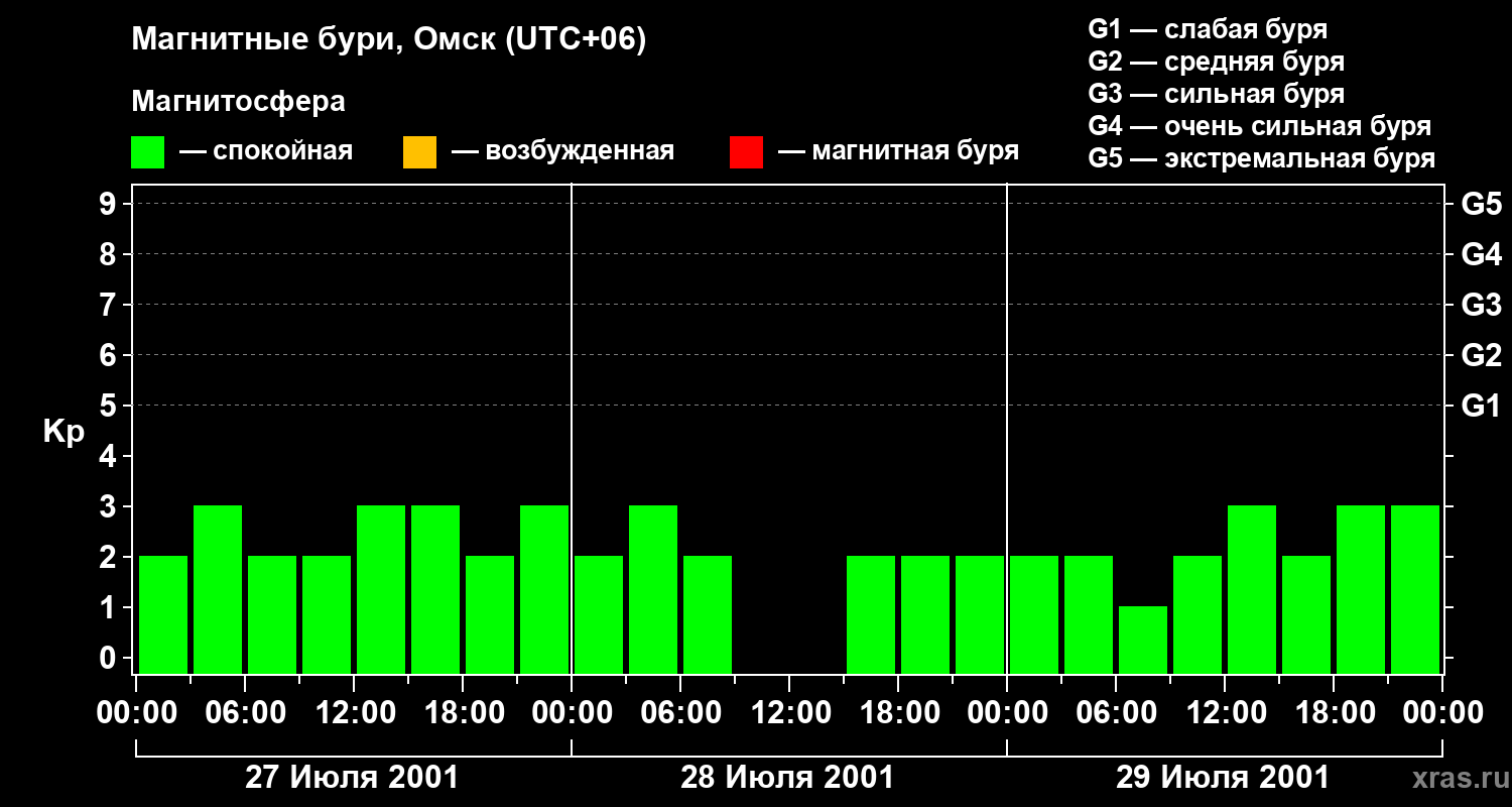 Изменения геомагнитного индекса Kp с 27 по 29 июля 2001 года для средних широт