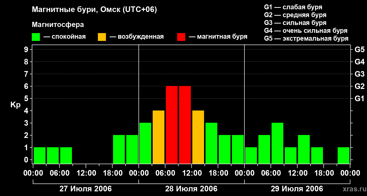 Изменения геомагнитного индекса Kp с 27 по 29 июля 2006 года для средних широт