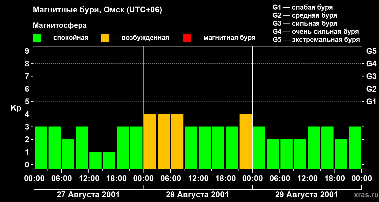 Изменения геомагнитного индекса Kp с 27 по 29 августа 2001 года для средних широт
