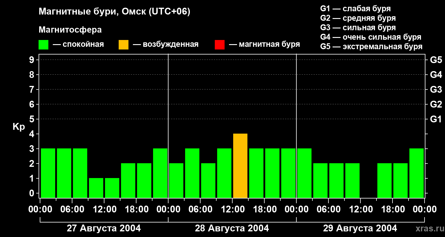 Изменения геомагнитного индекса Kp с 27 по 29 августа 2004 года для средних широт