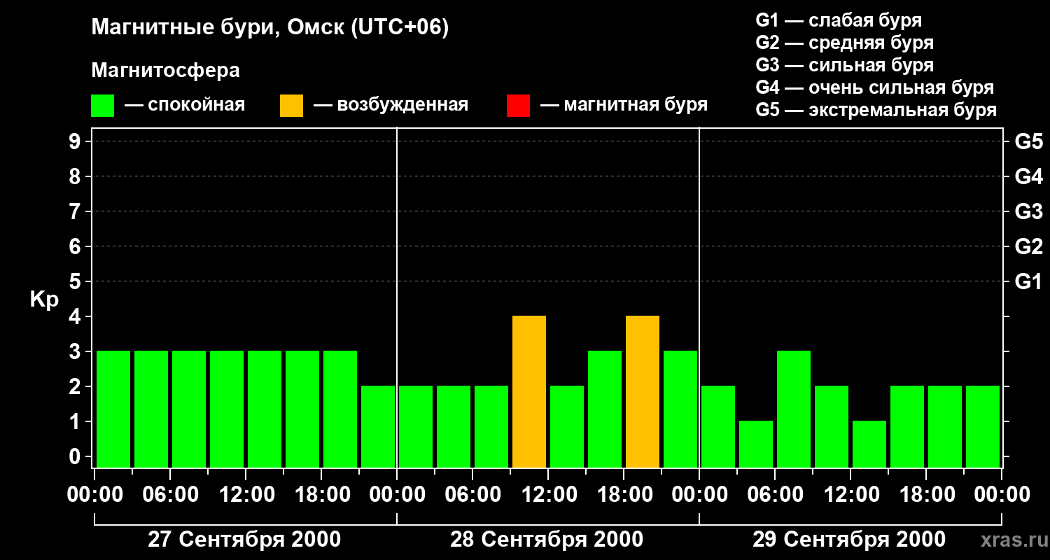 Изменения геомагнитного индекса Kp с 27 по 29 сентября 2000 года для средних широт