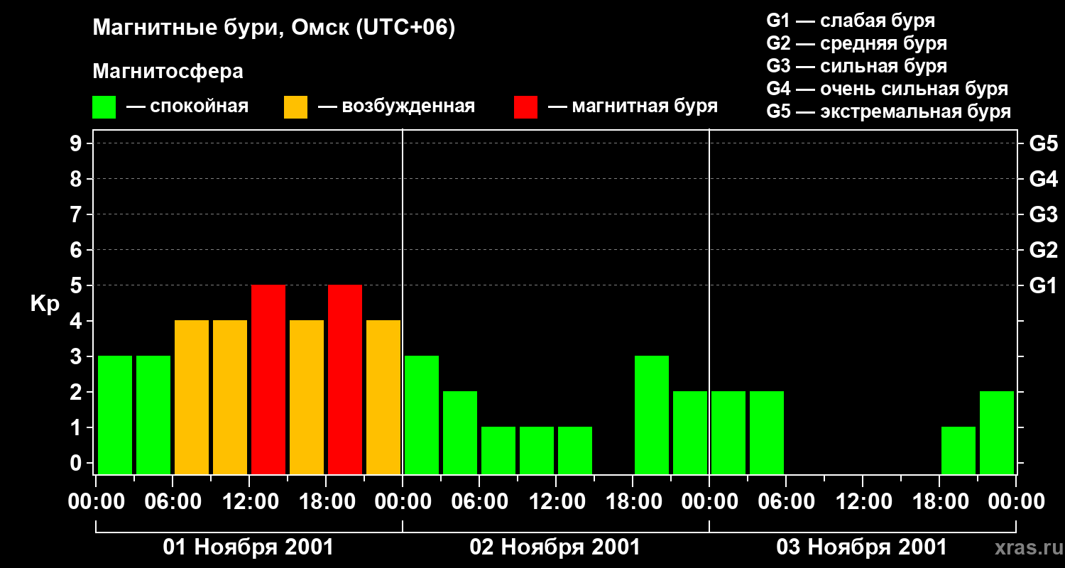 Изменения геомагнитного индекса Kp с 1 по 3 ноября 2001 года для средних широт